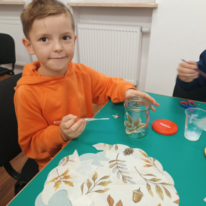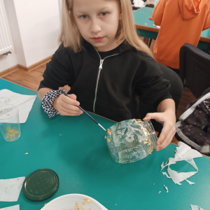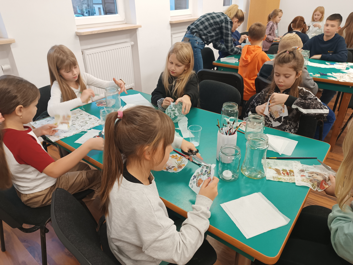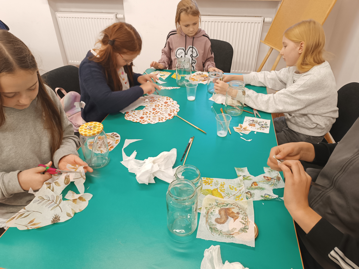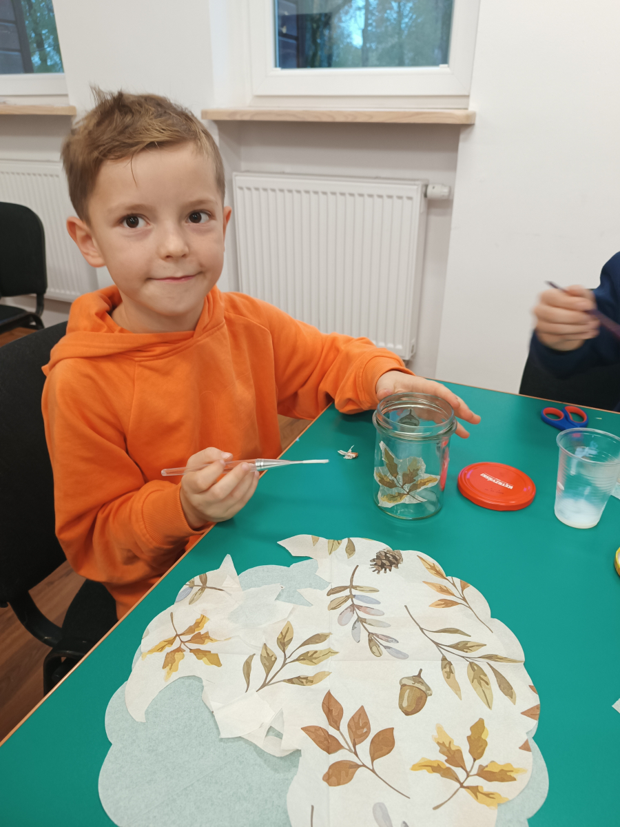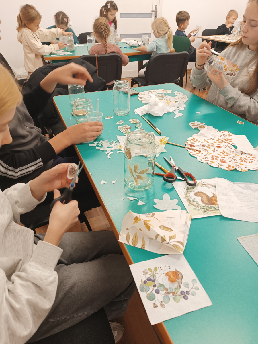 w GOKSiT odbyły się jesienne zajęcia plastyczne, na których dzieci tworzyły stroiki oraz miały okazję nauczyć się przekształcania zwykłych słoików w urokliwe lampiony. Podczas zajęć poznały technikę malowania i ozdabiania decoupage.
